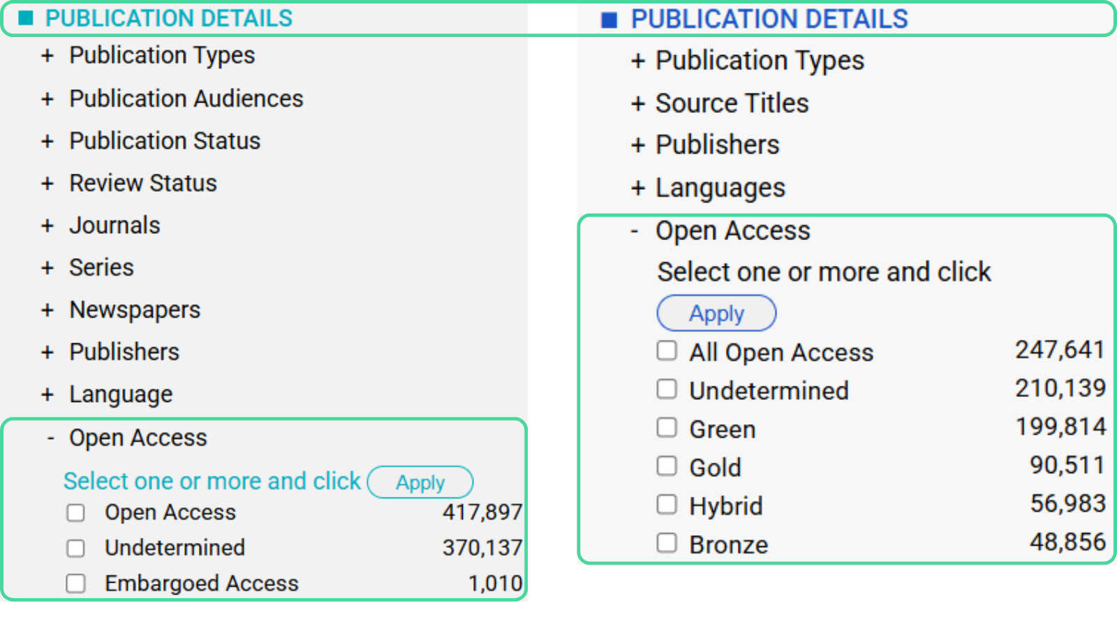 If you only wish to query publications with full text access, you can use the ‘Open Access’ filter in all the databases to limit your search to only contain Open Access publications.
