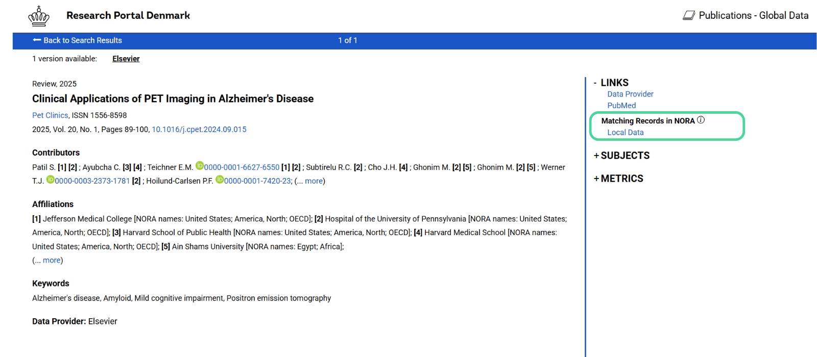 As the databases are bibliographic databases, you only have access to metadata, i.e. descriptive data, about all Danish publications within the data provider’s coverage. In addition, however, in both databases you can access a large number of full texts via the links you find on the full view publication records. Here you will find links to the full-text (Open Access) publications that the Danish Data Providers have registered, links to PubMed and other full-text links that may have been added by the global commercial data provider Elsevier.