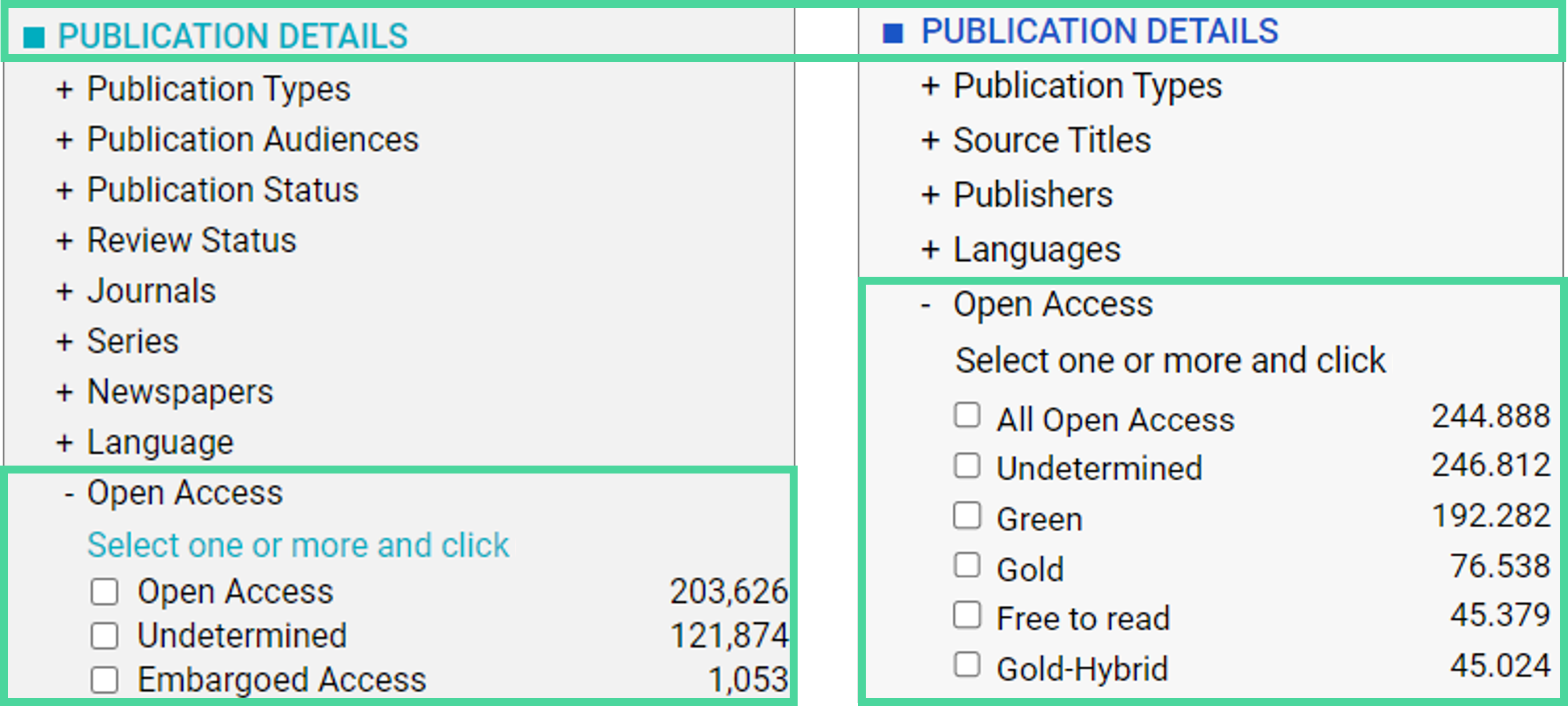 Hvis du ønsker kun at se publikationsposter der har adgang til en fuldtekst kan du i alle databaserne benytte filteret ‘Open Access’ til at afgrænse din søgning til kun at indeholde Open Access publikationer.