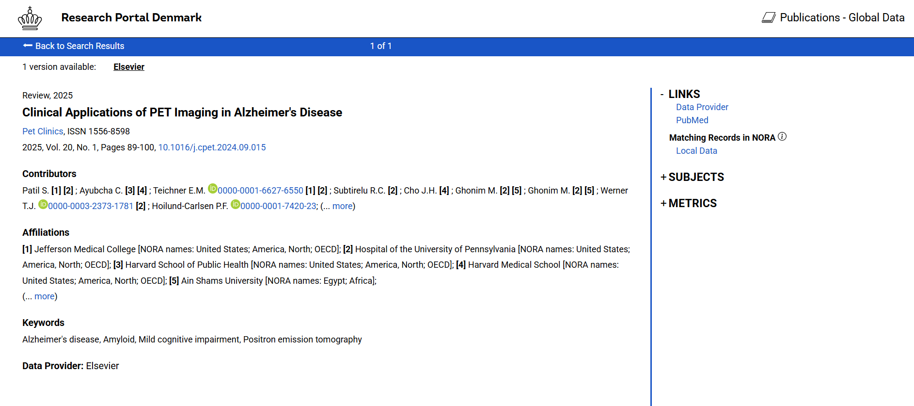 Publikationsdata i den Globale Database, er baseret på data fra den globale kommercielle dataleverandør Elsevier. Hvis data slettes her, vil det også blive reflekteret i Den Globale Database. Slettede poster fjernes to gange årligt i forbindelse med en fuld opdatering af genstandsfeltet fra den globale kilde.